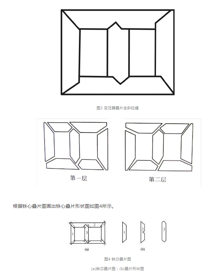 如圖3所示。為了進(jìn)一步降低鐵心的空載損耗,充分利用冷軋取向硅鋼片的特性,因此應(yīng)采用全斜接縫,這樣可使磁通方向與硅鋼片的軋制方向一致,使鐵心損耗達(dá)到最小。但這種接縫工藝復(fù)雜,疊裝的鐵心整體性差。