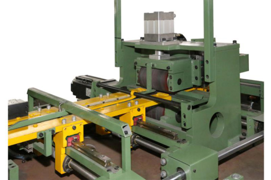 送料是本機的核心部分,它負責送料和測長,保證各種片型的長度精度,送料機主要核心部件有送料輥、測量輥、 導向定位導軌、伺服電機、編碼器、壓輥氣缸等組成。開卷機卷料料頭放出后,由送料機將卷料料頭送至沖剪床固定導軌。
